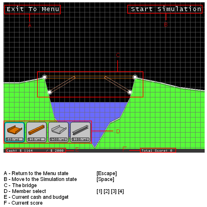 Following the opening, the game changes to the Editing state. The Editing state allows you to build your bridge. From this state, you can return to the Menu state and go to the Simulation state at will. You can move the camera with the 'A', 'S', 'D', and 'W' keys. You can also click and drag anywhere on the screen where no button is present to place members. The available members are roads and beams in either wood or steel. Steel is stronger, but much more expensive. It's more useful as a reinforcement material, rather than a building material.